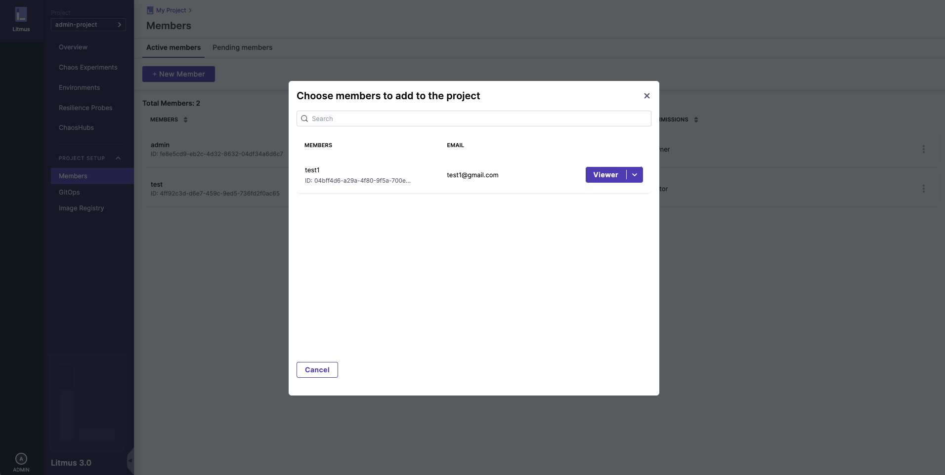 From the list of all available members, choose the ones you want to collaborate on your chaos with and decide what project level access they should have to your project (Viewer/Executor) and hit the same button.
